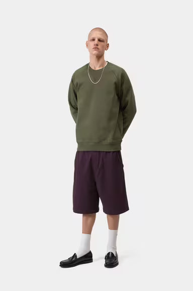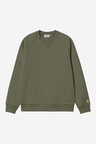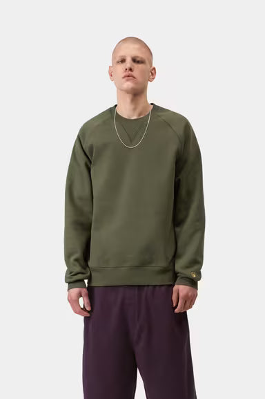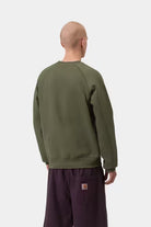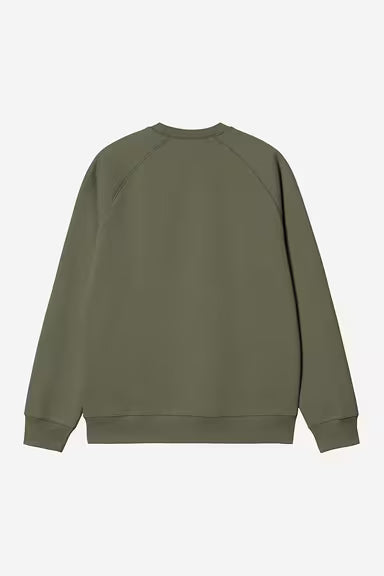 The Chase Sweatshirt is constructed from heavyweight polycotton fabric in a regular fit. The fabric has also been brushed, giving it a fleece-like backing. The item features raglan sleeves and is detailed with flatlock stitching. An embroidered 'C' Logo appears on the left sleeve.
