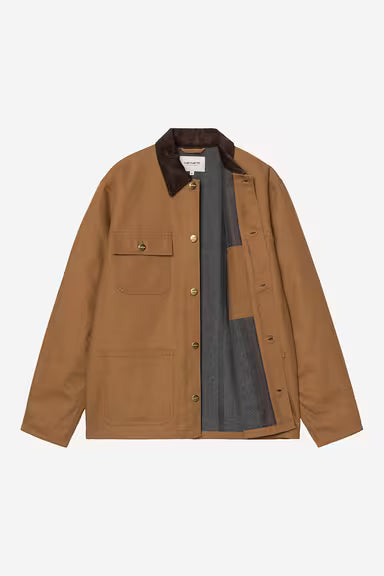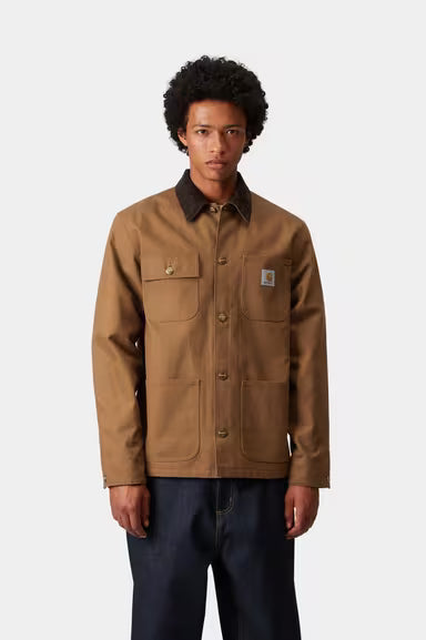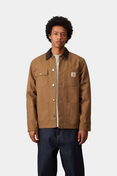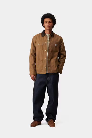 The Michigan Coat is constructed in Carhartt's classic, hard-wearing Dearborn Canvas, which has then been treated to make it water repellent. This canvas fabric will soften with wear, creating a jacket with a fit that is unique to you. Contrast button and rivet detailing, which draws from a classic workwear aesthetic. Blanket lined body retains warmth during the winter months.