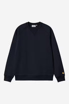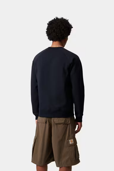 The Chase Sweatshirt is constructed from heavyweight polycotton fabric in a regular fit. The fabric has also been brushed, giving it a fleece-like backing. The item features raglan sleeves and is detailed with flatlock stitching. An embroidered 'C' Logo appears on the left sleeve.