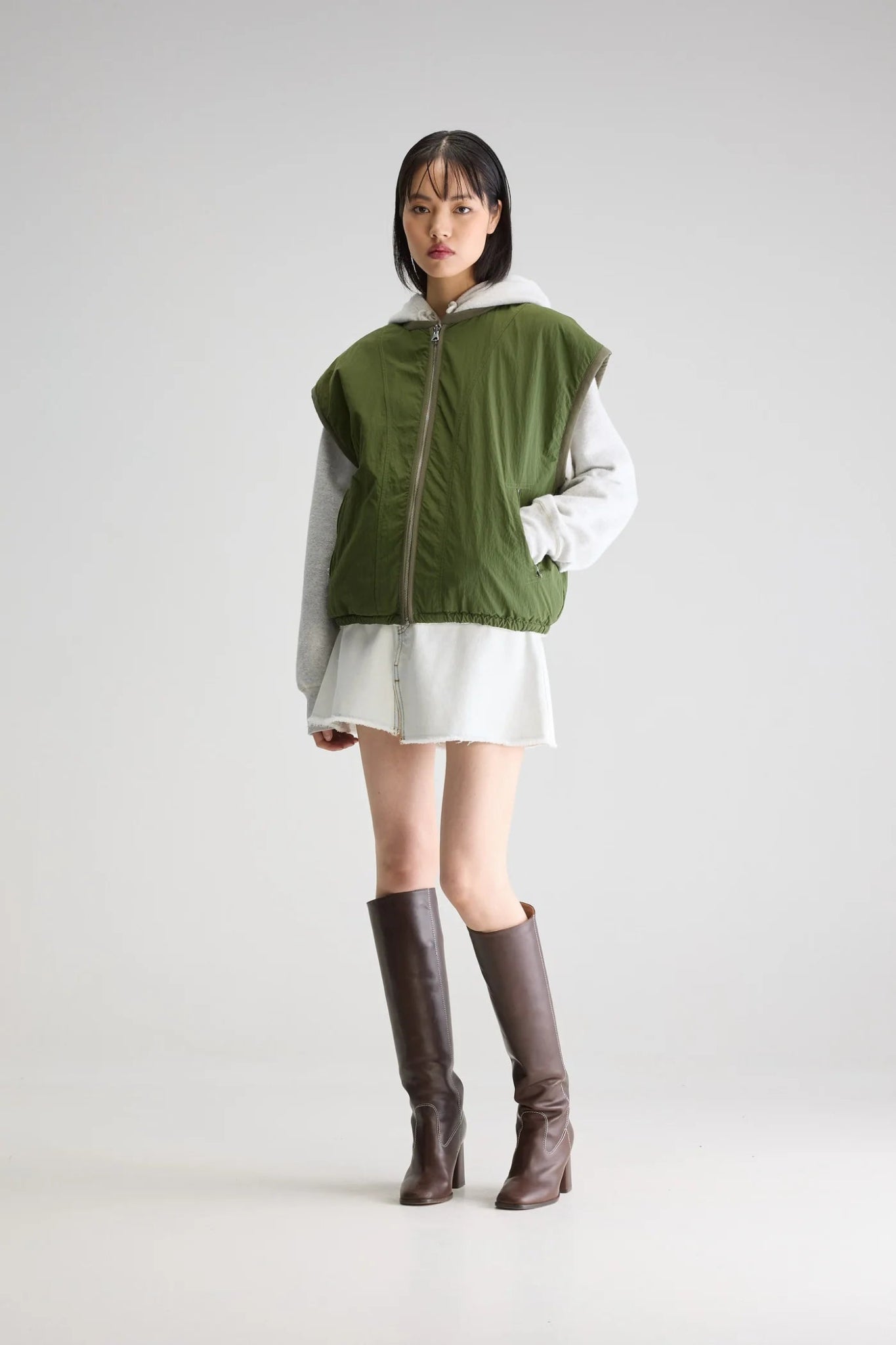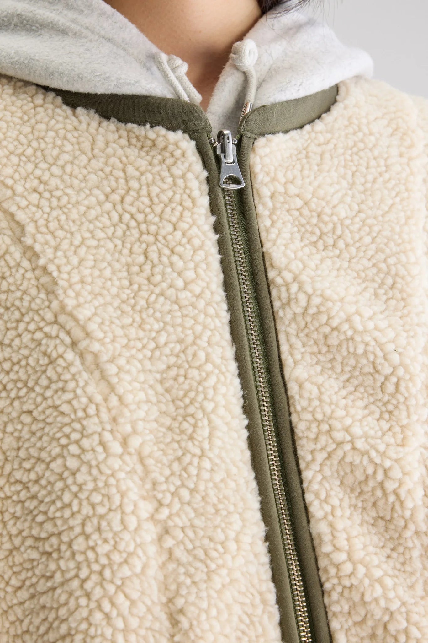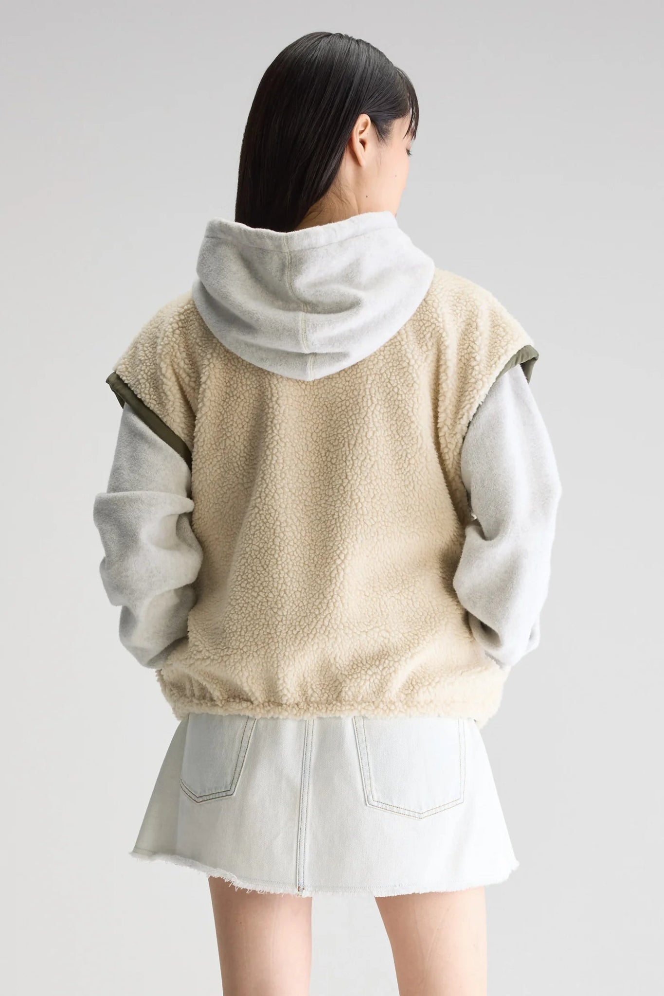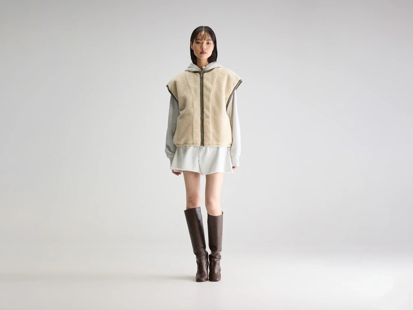 (Very) oversized, reversible bodywarmer with a zip front, a raised collar and pipped edges. One side in ecru teddy, the other in khaki crinkled nylon.