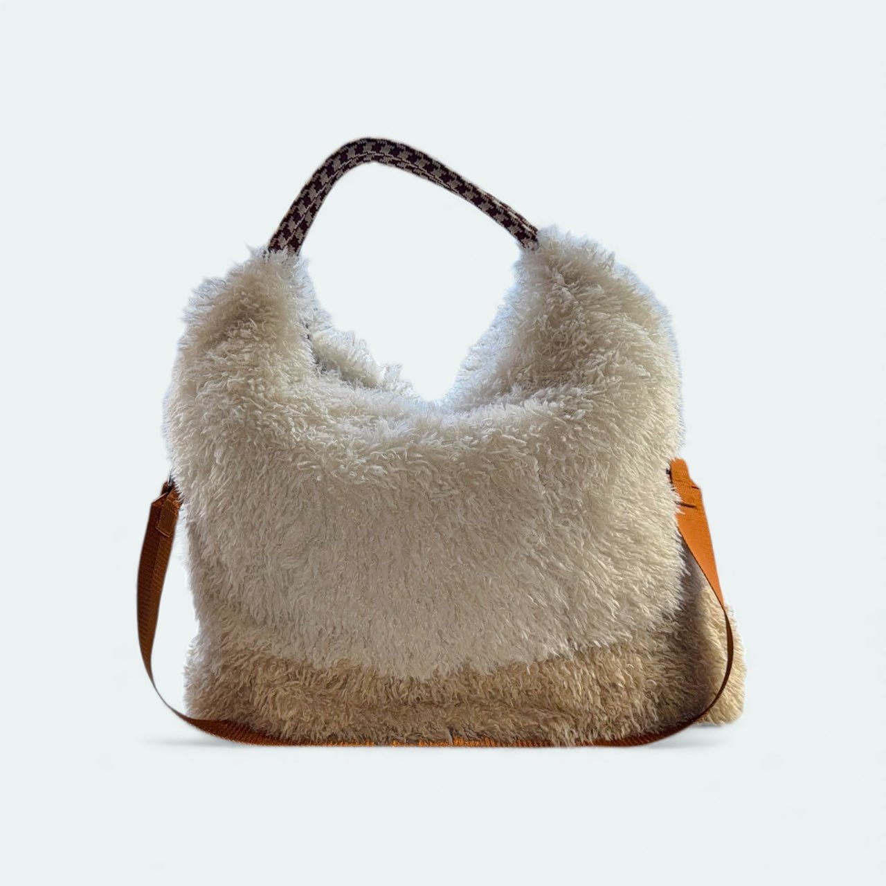 The Helado is the ultimate statement bag. Super fluffy 2 tone in cream and beige. Woven rope handle in brown and cream. Toffee satin strap. The long strap is attached using swivel snap hooks with can be removed if preferred.