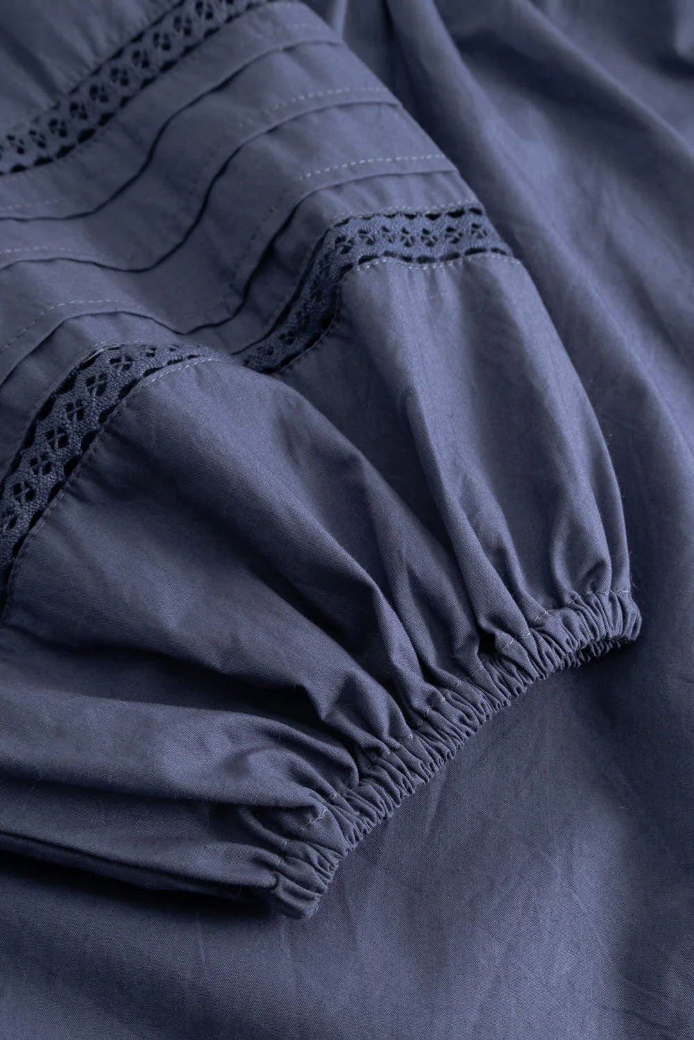 The N-Marceline Blouse is a long-sleeve blouse with a back cutline and balloon sleeves. It opens fully at the front and is secured with tie strings, creating a light, detailed look. The blouse features a round neckline and delicate lace detailing around the collar and sleeves.