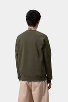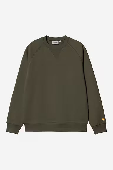 The Chase Sweatshirt is constructed from heavyweight polycotton fabric in a regular fit. The fabric has also been brushed, giving it a fleece-like backing. The item features raglan sleeves and is detailed with flatlock stitching. An embroidered 'C' Logo appears on the left sleeve.