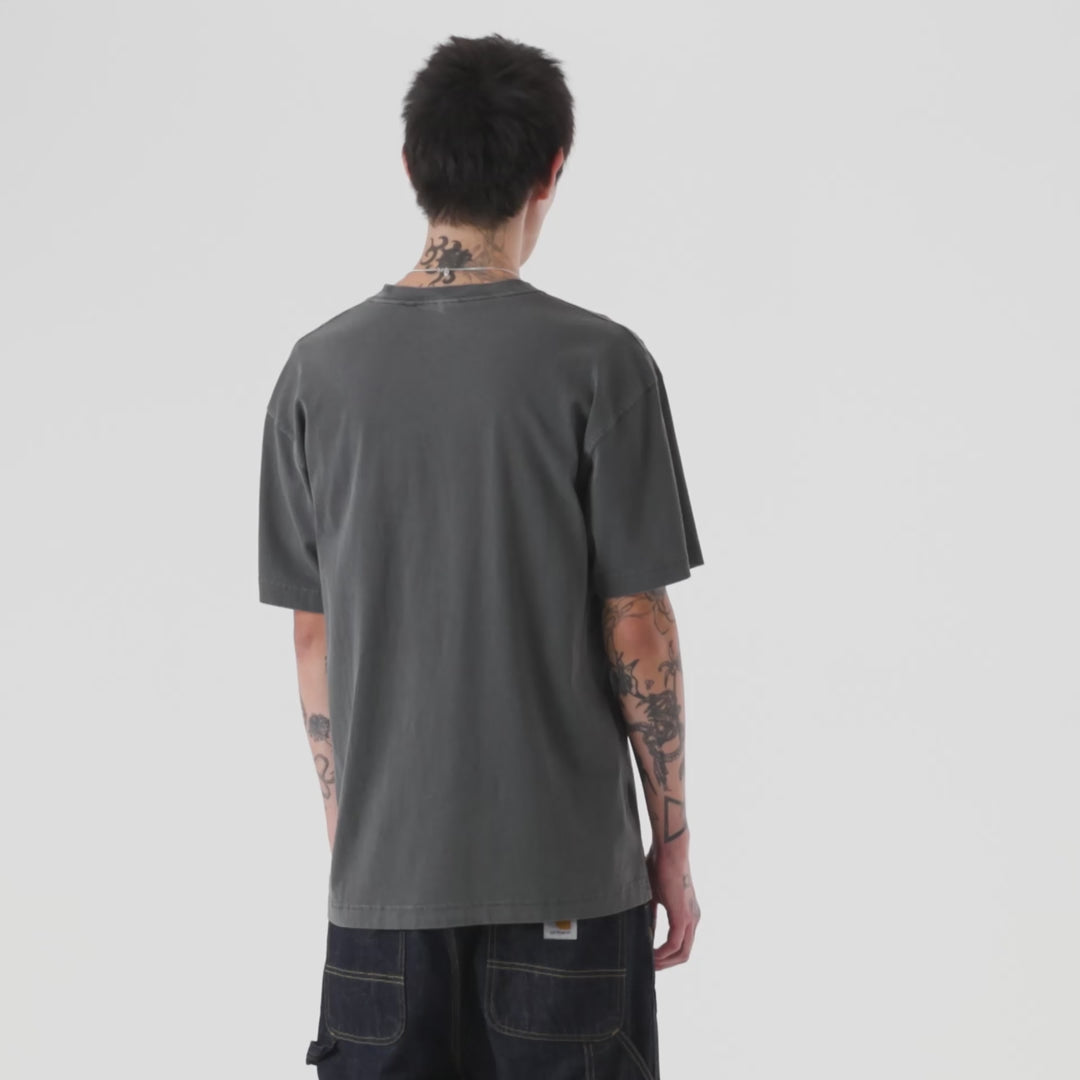 The S/S Vista T-Shirt is cut from midweight cotton jersey in a loose fit, featuring relaxed shoulders and a slightly longer hem. Additionally, the style has been garment-dyed, giving it a washed yet saturated hue. A woven Square Label, rendered murky by the garment-dyeing process, appears on the left chest.