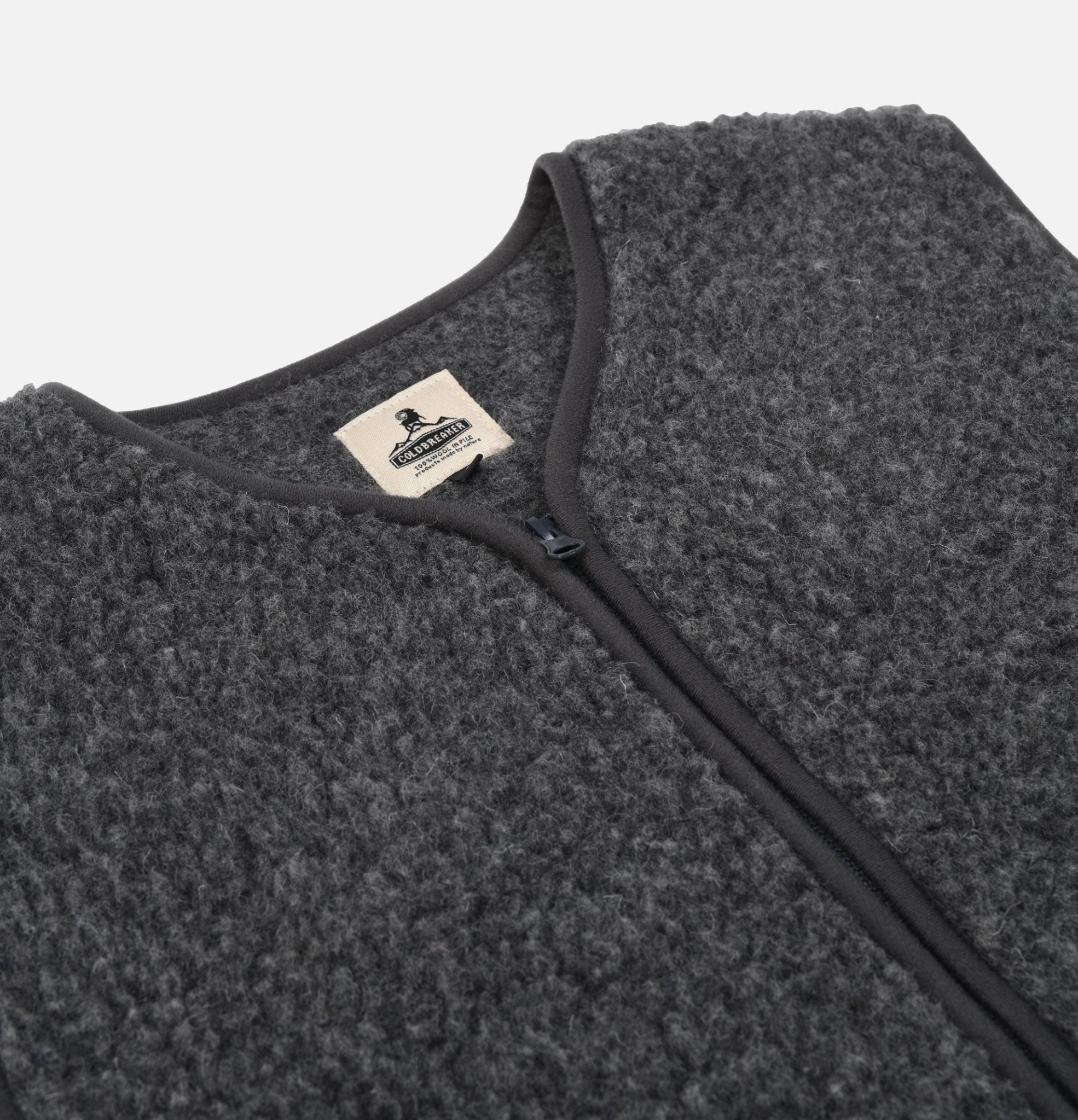 Vest Pepitko Graphite. Straight fit vest made in wool sherpa fabric from the Irish company YOKO, specialist in the field. Zipped closure. Patch pockets on the bottom. Braided edges.