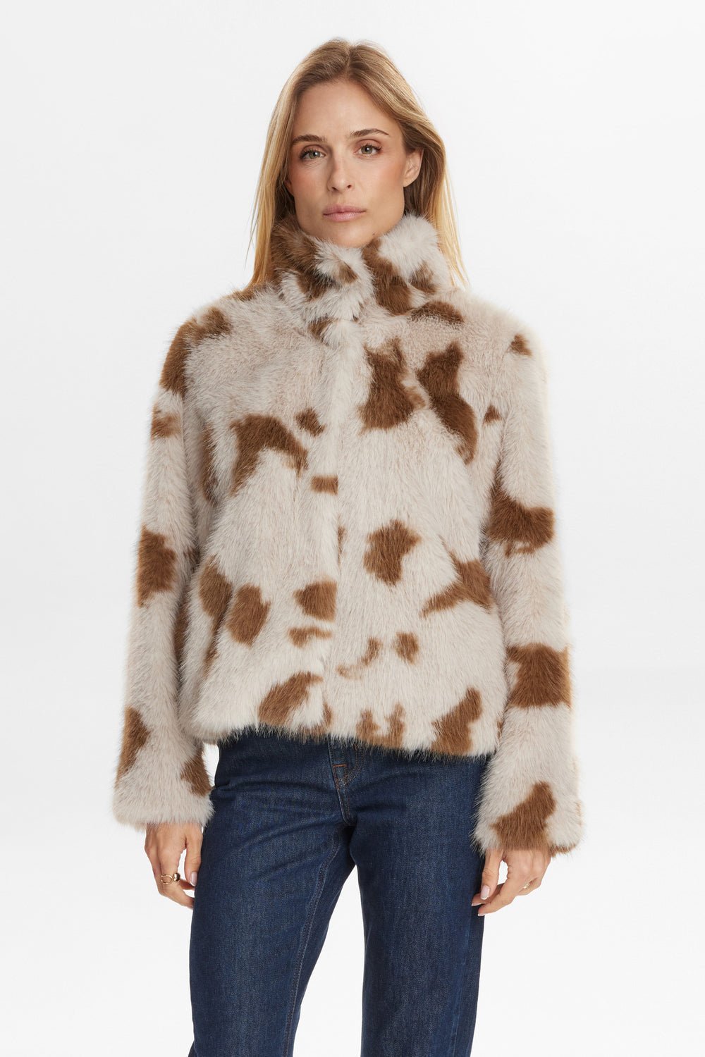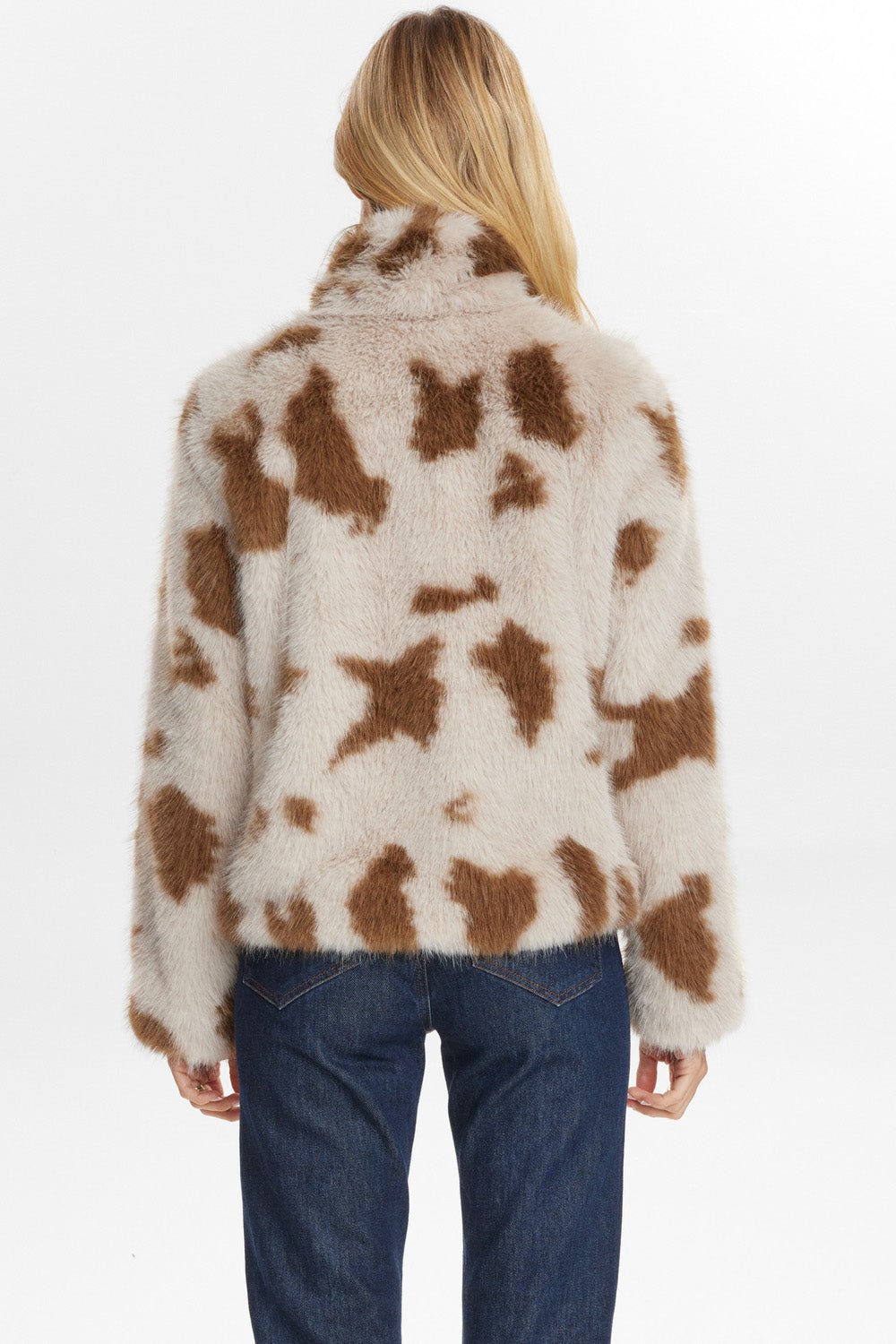 Super soft faux fur jacket. Cow print design with a high collar for ultimate cosyness. Popper button fastenings for easy closure. Pockets either side. Fully lined in satin.